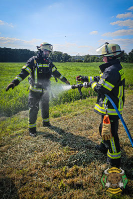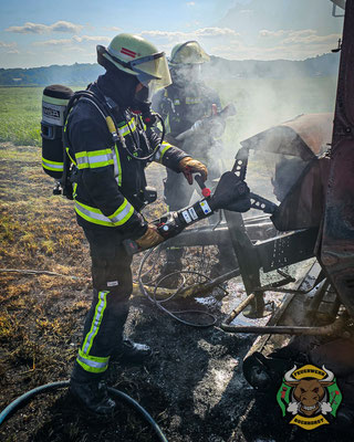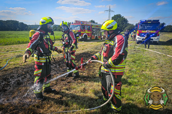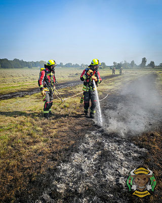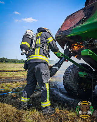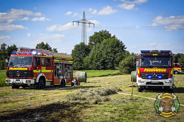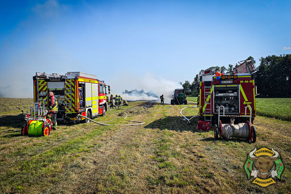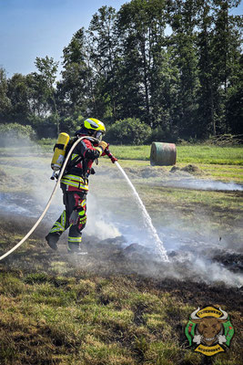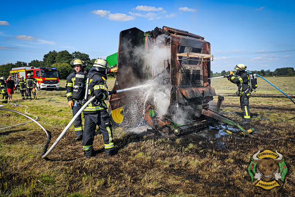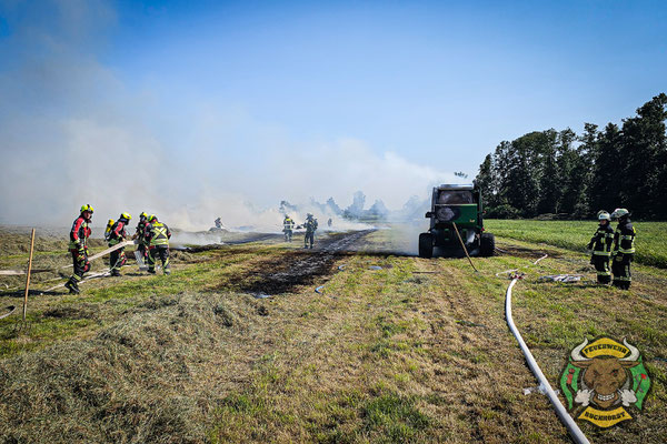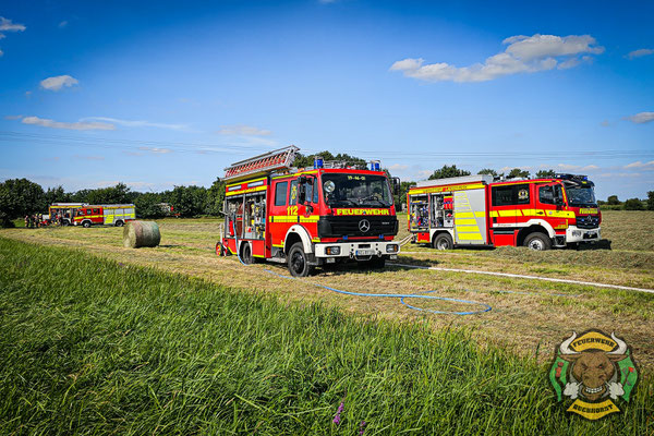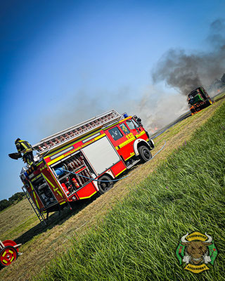 Eine weit sichtbare Rauchwolke wies den Einsatzkräften den Weg. Bereits 3 Minuten nach dem Alarm konnte das LF 16 ausrücken. Auf dem weichen, torfigen Untergrund war das Erreichen der Einsatzstelle keine leichte Aufgabe. Das Feuer hatte sich beim Eintreffen der ersten Kräfte bereits auf das Feld ausgebreitet. Das sehr trockene Heu bot den Flammen reichlich Nahrung. Der Wind trug ebenfalls dazu bei das sich die Flammen rasant ausbreiteten. Vom Buchhorster LF 16 wurde für den ersten Angriff das S-Rohr vorgenommen um die Ausbreitung einzugrenzen. Wenige Minuten später traf dann das Lauenburger LF20 an der Einsatzstelle ein. Mit D-Schläuchen griffen sie das Feuer im hinteren Bereich an um eine weitere Ausbreitung zu verhindern. Durch diese ersten Maßnahmen gelang es das Feuer zügig einzudämmen. Zum Ablöschen der Ballenpresse wurde dann im weiteren Verlauf ein C-Rohr mit Netzmittel eingesetzt. Durch das zügige Eingreifen beider Wehren konnte das Feuer auf ca. 500m² begrenzt werden. Die Nachlöscharbeiten waren nach ca. einer Stunde beendet. Mit leeren Wassertanks war das Abfahren von der Wiese dann auch kein Problem.