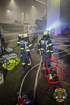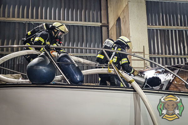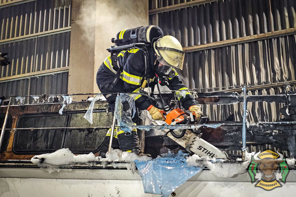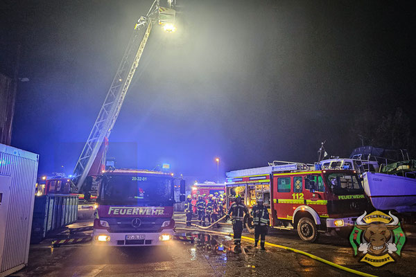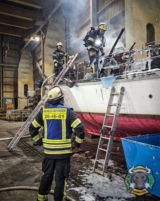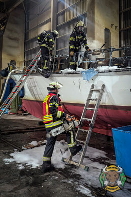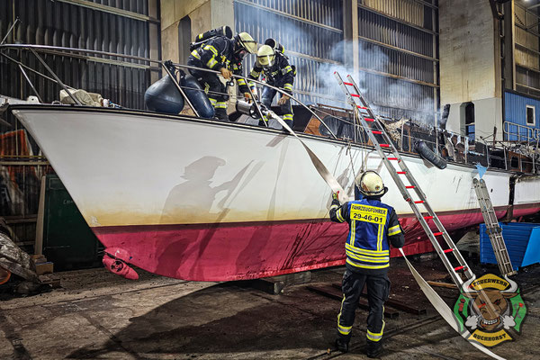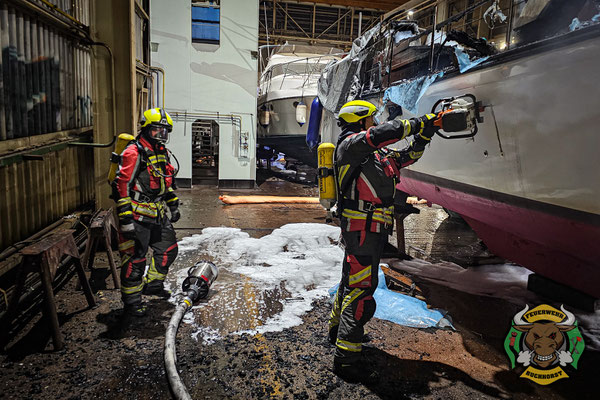 Kurz nach dem Eintreffen an der Einsatzstelle wurde die Feuerwehr Buchhorst nachalarmiert. Es brannte eine ca. 20m lange Motoryacht in voller Ausdehnung. Die große Werfthalle war nahezu komplett verraucht. Es wurde zunächst die Brandbekämpfung mit einem C-Rohr eingeleitet und parallel dazu eine geeignete Belüftung der Halle erkundet. Durch die Größe der Halle (ca.50x130m) war eine Ventilation mittels Lüftern ausgeschlossen. Die Halle wurde schließlich über die großen Werft Tore belüftet.