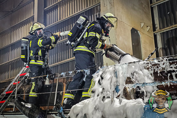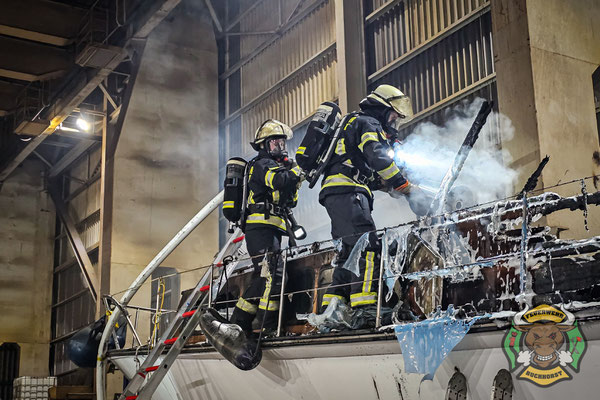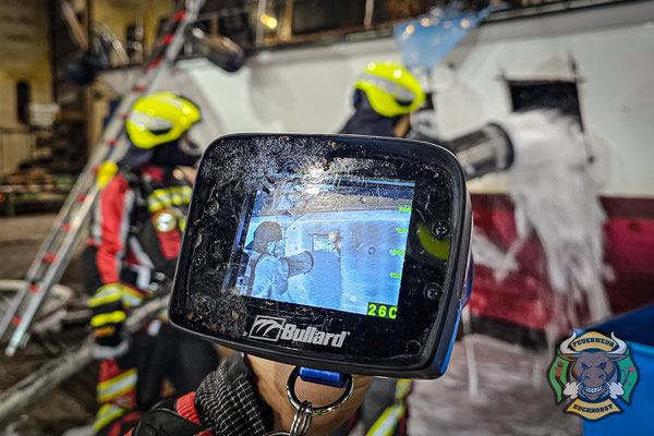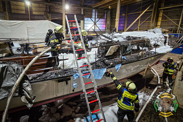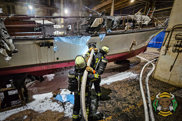 Nachdem die ersten Flammen niedergeschlagen waren, gestalteten sich die weiteren Löschmaßnahmen schwierig. Das Innere des Bootes konnte nicht mehr gefahrlos betreten werden und in den Zwischenwänden flammte es immer wieder auf. So entschied man sich schließlich das Boot mit Mehrbereichsschaummittel zu fluten. Diese Maßnahme brachte dann den gewünschten Erfolg und das Feuer war nach ca. 2 Stunden gelöscht.
